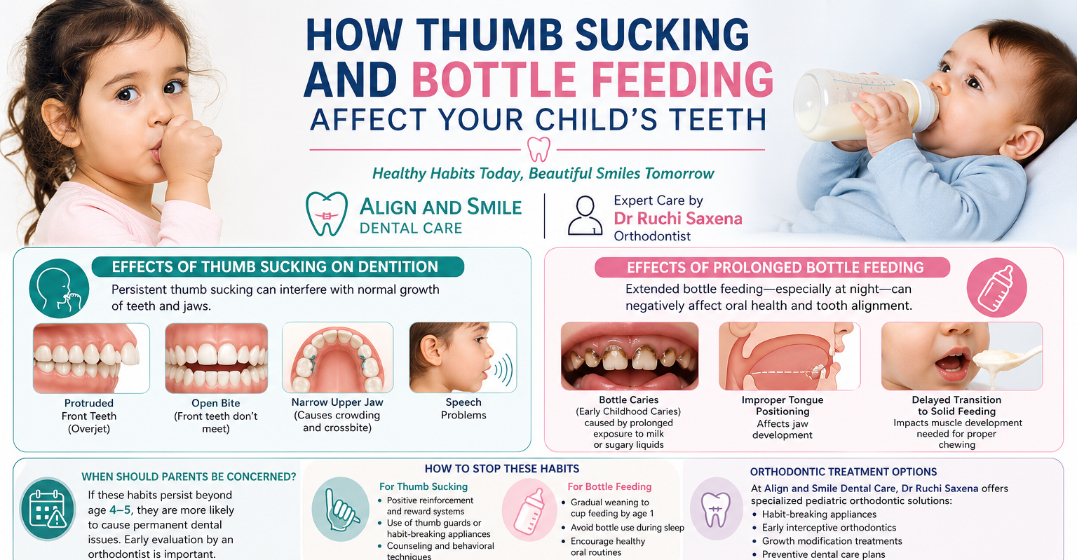 Thumb sucking and bottle feeding are natural soothing habits in infants and toddlers. However, if these habits continue beyond the early developmental years, they can lead to serious orthodontic problems. At Align and Smile Dental Care in Sector 18 Noida, we often see children with dental issues caused by prolonged oral habits.